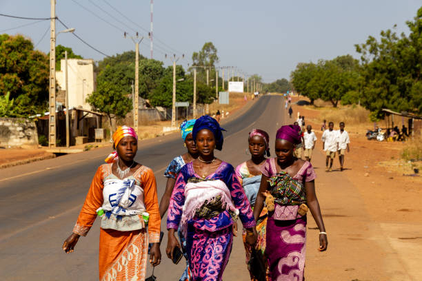 SANKANDI, GAMBIA- JAN 6, 2014: Once a month the doctor comes to town. Young woman with babies dress up for the occasion and walk together to have the monthly health checkup IMAGE SOURCE GETTY
